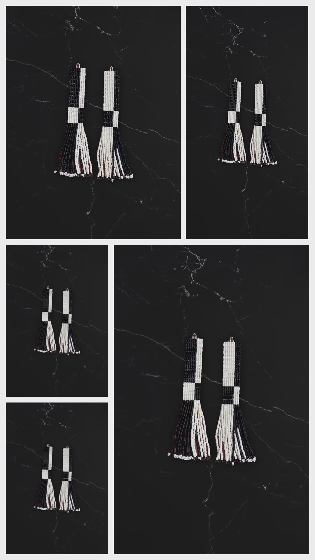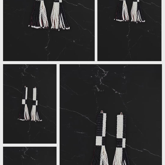 black and white beaded earrings, fringe earrings, handmade statement earrings, minimalist beaded jewelry, seed bead earrings, boho monochrome earrings, long beaded earrings, artisan fringe earrings, graphic earrings, colorblock earrings, slow fashion jewelry, lightweight handmade accessories, handcrafted earrings, bold earrings